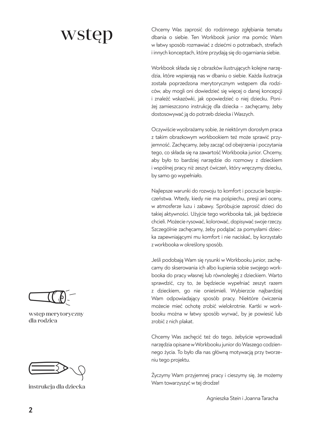 Workbook junior został tak przygotowany, by wspierać dziecko i dorosłego w rozwijaniu języka, który pomaga rozumieć i troszczyć się o siebie. Proponowanym narzędziem do rozwoju jest twórczość, zabawa i pobudzanie ciekawości.