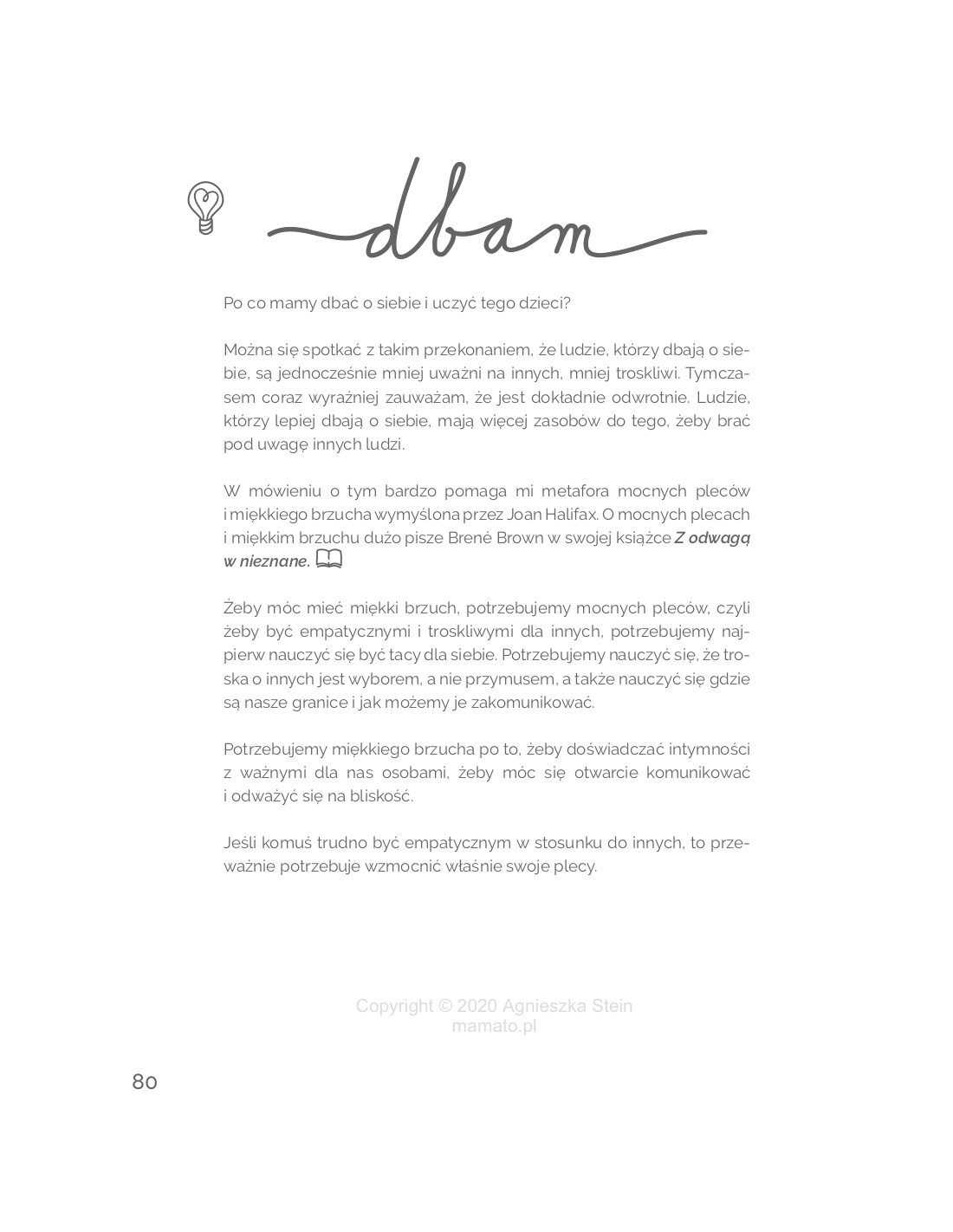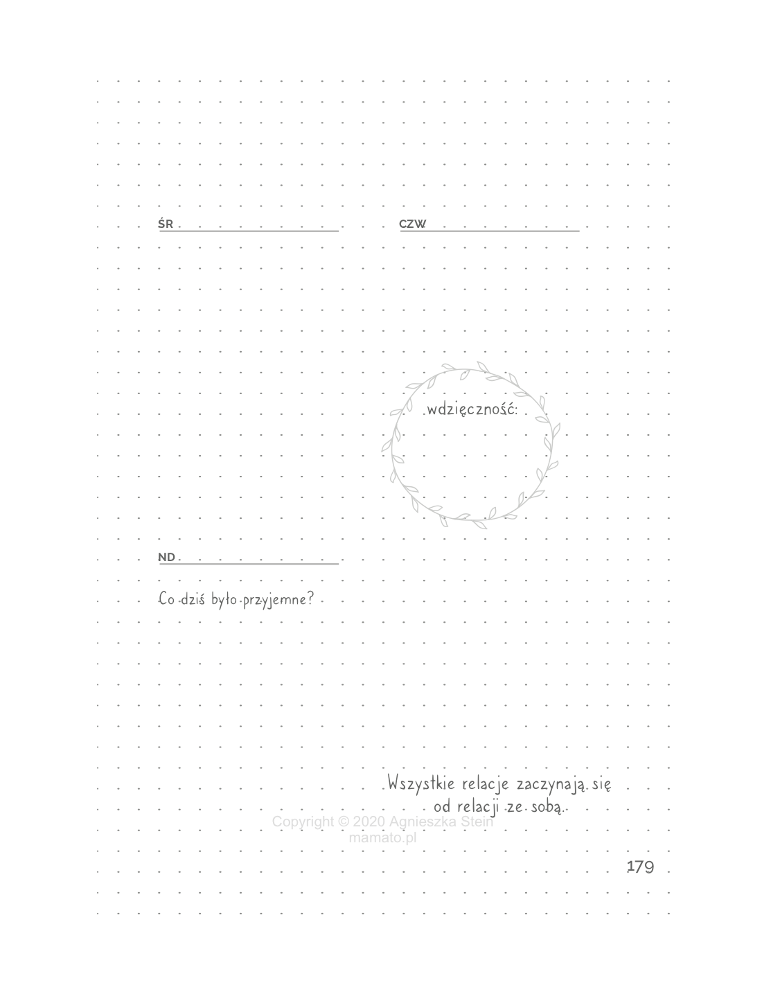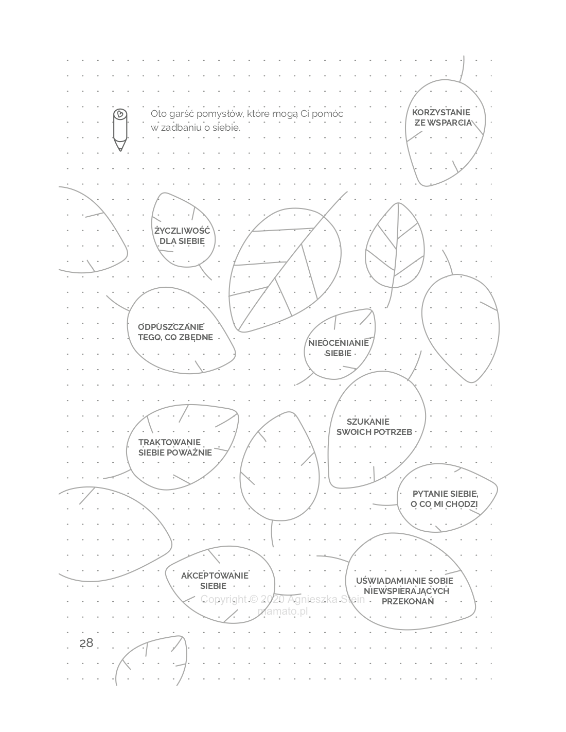 Znajdziesz w nim dużo przestrzeni na własne przemyślenia i pracę ćwiczeniową w obszarach rodzicielskich, a także chwilę na rozluźnienie i sprawdzenie, jak się masz w swoim ciele. Odrobina wiedzy pomoże Ci lepiej zrozumieć zagadnienia, nad którymi będziesz pracować. A otwarta forma ćwiczeń i obszarów do kolorowania sprawi, że będzie to przyjemna praca.